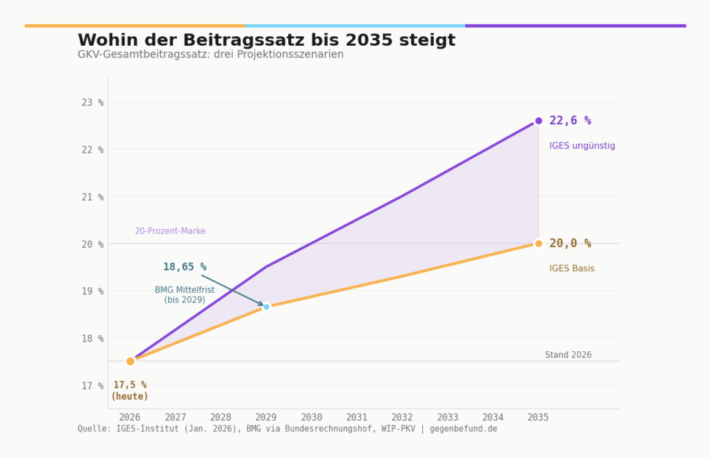 Das IGES-Institut veröffentlichte im Januar 2026 im Auftrag der DAK eine Projektion: Im Basisszenario erreicht der GKV-Gesamtbeitragssatz bis 2035 die Marke von 20 Prozent. Im ungünstigen Szenario, das höhere Arzneimittelkosten und eine schwächere Lohnentwicklung annimmt, sind es 22,6 Prozent.[7] Das Mittelfristmodell des BMG selbst kalkuliert mit einem Zusatzbeitrag von 4,05 Prozent bis 2029, was einem Gesamtbeitrag von 18,65 Prozent entspricht.[5]